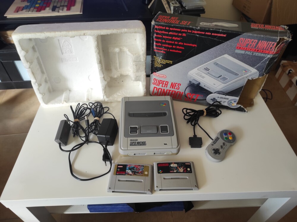 Vendo esta consola Super Nintendo SNES em muito bom estado de conservação e funcionamento. A consola tem os cabos originais, comando original, caixa (danificada) + insert originais e tem os jogos Super Star Wars e Street Fighter 2 em bom estado.